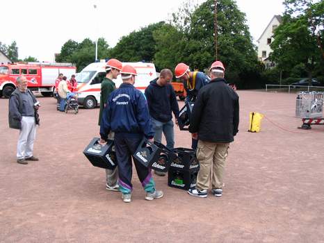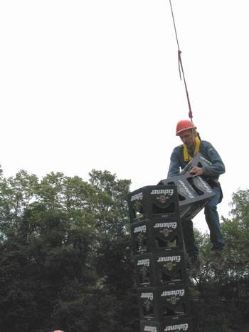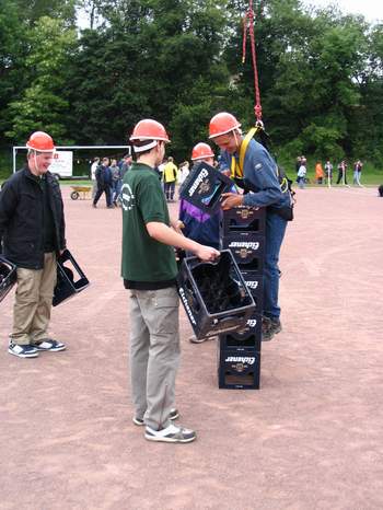 Dies war die erste von uns absolvierte Disziplin. Ziel war es, so viele leere Kästen Eichener Bier wie möglich übereinander zu stapeln. Hierfür wurden sicherheitshalber Helme verteilt. Es gab einen "Stapler", der auf dem immer höher werdenden Turm die Kisten übernander setze, und sein Team aus "Werfern", welche die Aufgabe hatten, ihm die Kisten anzureichen / hochzuwerfen. Der "Stapler" war zusätzlich über ein Seil von der Leiter eines Feuerwehrwagens gesichert. | ||||||||||||||||||||||||||||||||||||||||||||||||||||||||||||||||||||||||||||||||