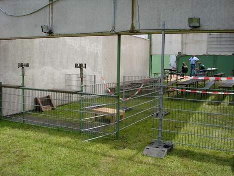 | Der Schießstand vor Schießbeginn. Ebenfalls in Aufbau und Abmessungen genau an die gesetzlichen Vorschriften gehalten. | ||||||||||||||||||||||||||||||||||||||||||||||||||||||||||||||||||||||||||||||||