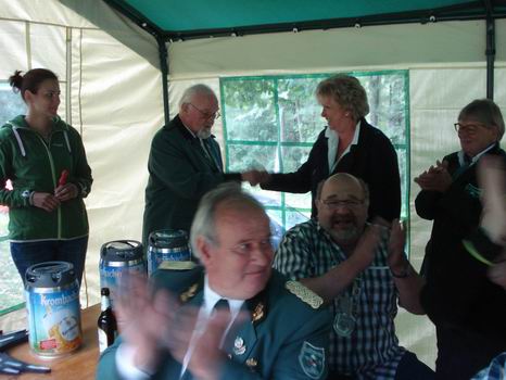 Vom Jedermannschießen am zweiten Tag gibt es Dank miesem Wetter nur wenige Fotos von sehr bescheidener Qualität. Die Ehrungen mussten wegen Dauerregen im Zelt abgehalten werden. Hier jedoch die neue Jedermannkönigin Doris Hinkel bei der Gratulation, welche mit dem 247. Schuss den Vogel von der Stange holte. | ||||||||||||||||||||||||||||||||||||||||||||||||||||||||||||||||||||||||||||||||