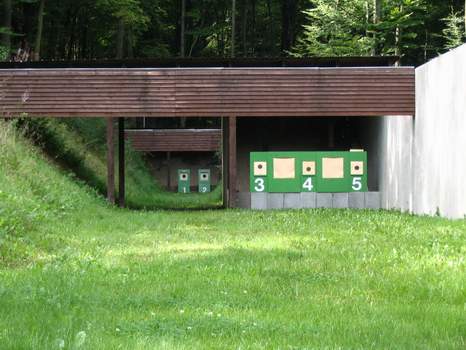 | Blick aus dem Groß- und Kleinkaliberstand auf die 50 und 100 Meter Distanz der Außenanlage; links eine "rangezoomte" Nahansicht. | ||||||||||||||||||||||||||||||||||||||||||||||||||||||||||||||||||||||||||||||||||||
