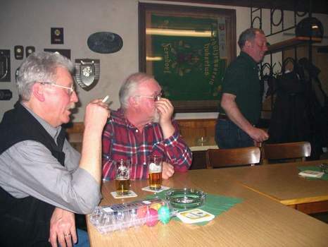 Nachdem die meisten Eier einen Besitzer gefunden hatten, ging man zum gemütlichen Teil des Abends über ... Beim geselligen Beisammensein wurde sich mit Bier und belegten Brötchen gestärkt und noch so manche Geschichte zum Besten gegeben. | |||||||||||||||||||||||||||||||||||||||||||||||||||||||||||||||||||||||||||||||||