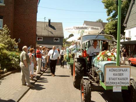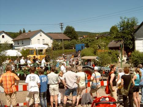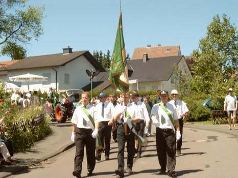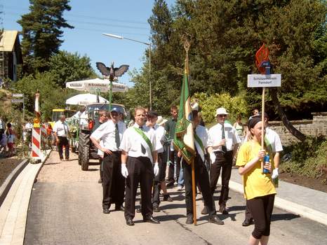 Am 20. Juni 2005 fand der große Festzug zum 125jährigen Bestehen der Feuerwehren Kreuztal und Ferndorf statt. Unser Verein war ebenfalls mit einem Wagen und reichlich Fußvolk mit von der Partie. Zwischen halb 2 und 2 Uhr formierte sich der Festzug in Kreuztal (Breslauer Straße / Erbstollen), bevor es kurz nach 2 dann endlich losging. Der Tag war knallig heiß mit Temperaturen von bis zu 30 Grad. Dementsprechend schwitzten wir in unserer Vereinskleidung. | |