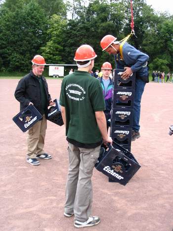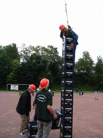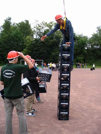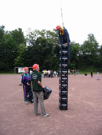 Dies war die erste von uns absolvierte Disziplin. Ziel war es, so viele leere Kästen Eichener Bier wie möglich übereinander zu stapeln. Hierfür wurden sicherheitshalber Helme verteilt. Es gab einen "Stapler", der auf dem immer höher werdenden Turm die Kisten übernander setze, und sein Team aus "Werfern", welche die Aufgabe hatten, ihm die Kisten anzureichen / hochzuwerfen. Der "Stapler" war zusätzlich über ein Seil von der Leiter eines Feuerwehrwagens gesichert. | ||||||||||||||||||||||||||||||||||||||||||||||||||||||||||||||||||||||||||||||||