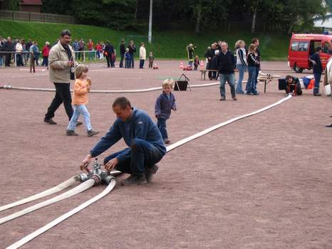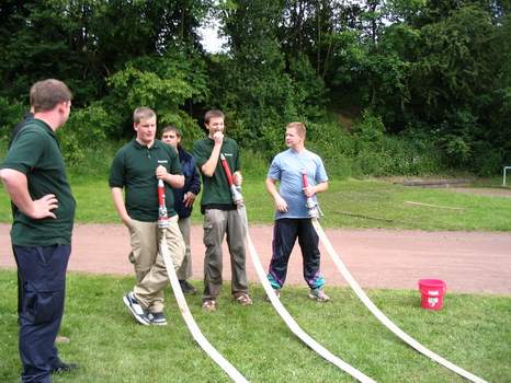 Aufgabe war es, einen Luftballon durch 3 Feuerwehrschläuche, die sich über ein Ventilsystem zu einem einzigen vereinten, aufzublasen und an einem Nagel im Zielkästchen zum Platzen zu bringen. |