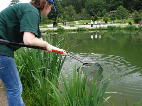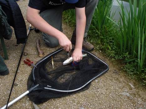Die dickste Forelle des Tages! Nachdem sie erfolglos versuchte eine Angel zu fressen, zog sie diese komplett in den Teich ... und niemand der Umherstehenden hats gemerkt!!! Sekunden später hingen 4 Angeln ineinander, im Glauben an den größten Fisch im Teich. Leider fingen sie nur die verschwundene Angeln wieder heraus! Der Fisch hatte sich inzwischen losgerissen und verhedderte mit Schwimmer und Metern an Schnur im Maul munter die Angeln auf der anderen Teichseite. Doch hier gab es dann kein Entkommen mehr für ihn, nachdem sich 3 weitere Angeln um ihn verwickelt hatten | ||||||||||||||||||||||||||||||||||||||||||||||||||||||||||||||||||||||||||||||||
